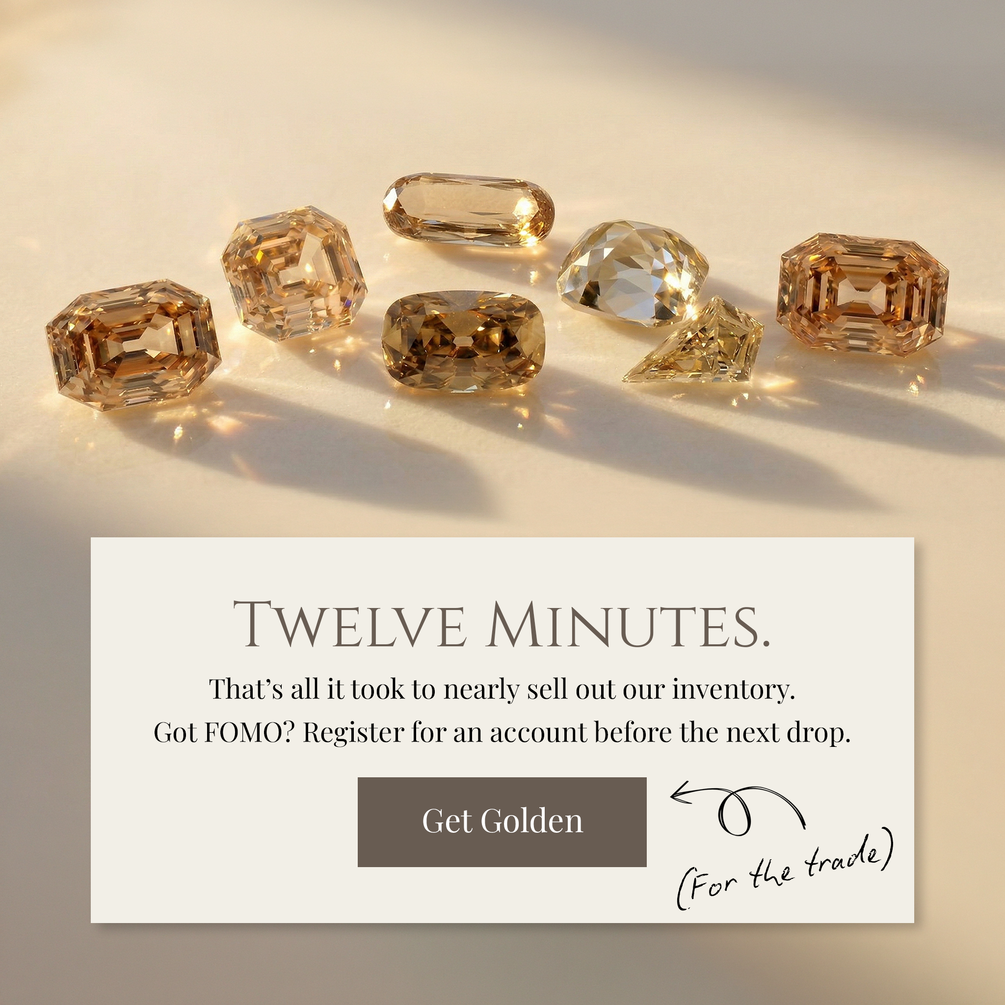 We specialize exclusively in warm champagne lab diamonds: rare, radiant stones formed by chance within a world engineered for sameness. Each piece glimmers a golden glow and perfect sparkle.